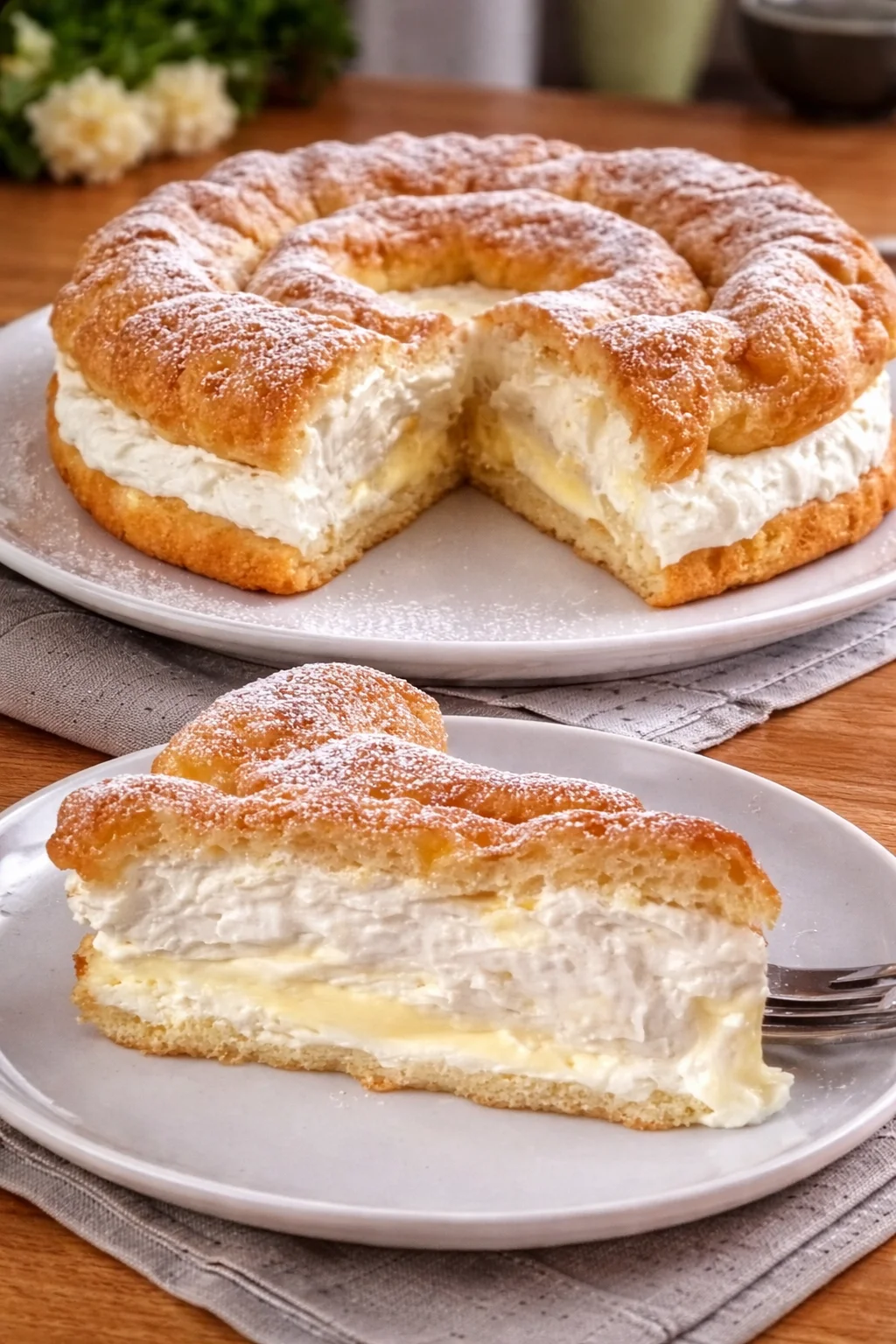 This Cream Cheese Cake is a light, airy dessert made with a fluffy choux-style base, a creamy vanilla custard layer, and a rich whipped creamโ€“cream cheese topping. Finished with a golden, crisp top and a dusting of powdered sugar, this cake is elegant yet surprisingly easy to makeโ€”perfect for family gatherings, holidays, or anytime you want a show-stopping dessert.