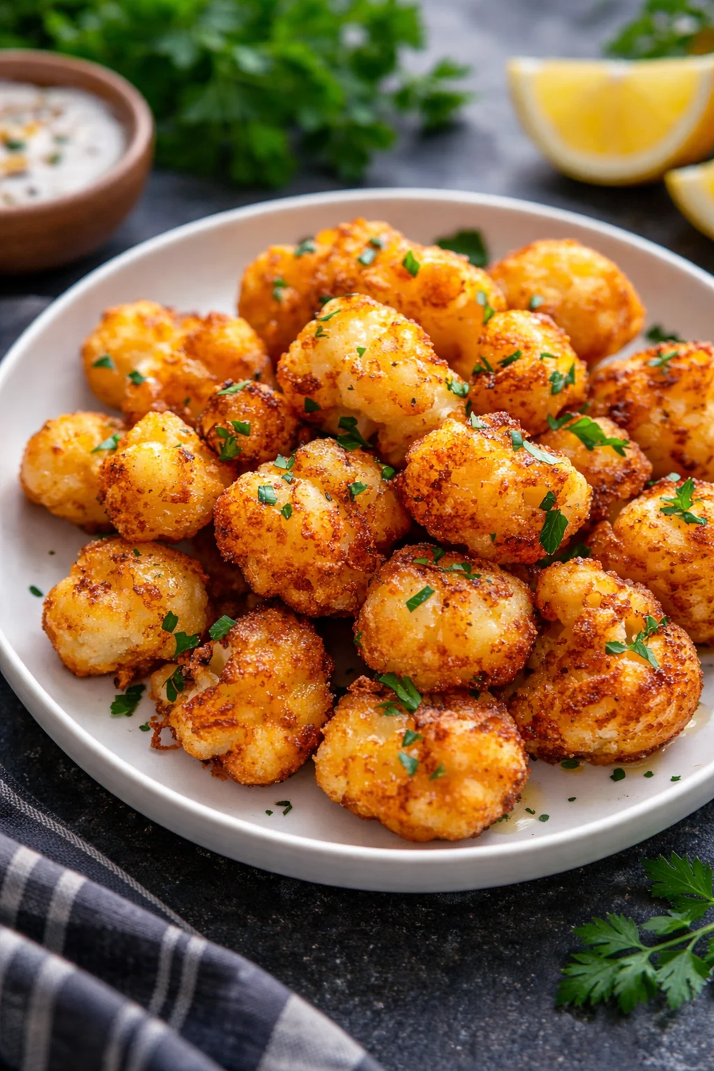 These Crispy Roasted Cauliflower Bites are golden, crunchy on the outside, and tender on the inside. Made with simple pantry spices and roasted to perfection, this easy cauliflower recipe works as a healthy appetizer, snack, or side dish. Serve it with your favorite dipping sauce for a crowd-pleasing vegetarian option.