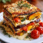 This vibrant, meatless Mediterranean-style lasagna is layered with roasted eggplant, zucchini, sweet bell peppers, creamy herbed ricotta, and rich tomato sauce. Itโs light yet comforting โ the kind of dish that feels indulgent but is packed with wholesome vegetables.